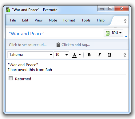 I’m a heavy Evernote user and have incorporated it into many aspects of my daily work. One thing I use it for and would like to promote is the IOU notebook – keep track of what you have loaned from others as well as what they’ve loaned from you!